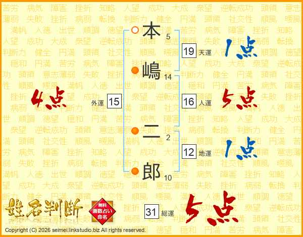 本嶋二郎さんの総運は31画の5点!