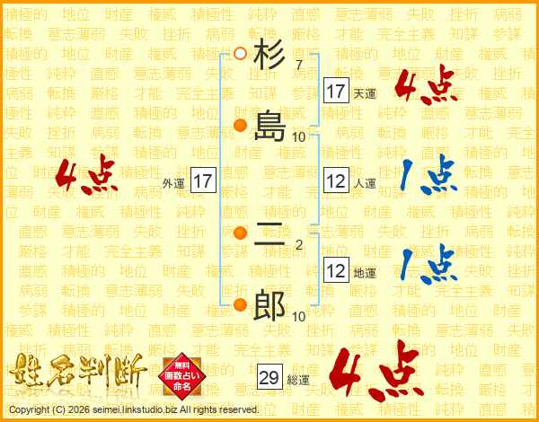 杉島二郎さんの総運は29画の4点!