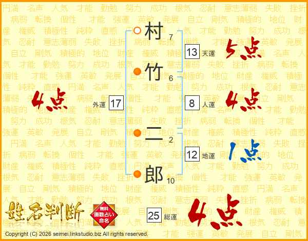村竹二郎さんの総運は25画の4点!
