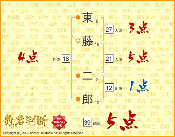 あなたの人生を表す1番重要な運勢です。生涯を通じて影響する総合運となり、主に50歳以降の晩年期に影響を及ぼします。苗字と名前の合計画数。