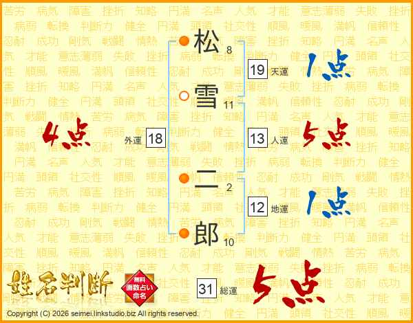 あなたの人生を表す1番重要な運勢です。生涯を通じて影響する総合運となり、主に50歳以降の晩年期に影響を及ぼします。苗字と名前の合計画数。