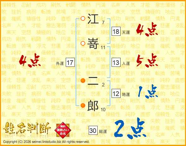 江(7画)嵜(11画) 二(2画)郎(10画)