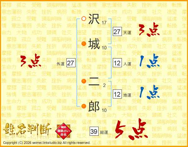 生活面を象徴する運勢です。外部から受ける影響力を表し、結婚運、家庭運や職場、環境への順応性を表します。総運から人運を引いた画数。姓や名が1文字の場合を除く。