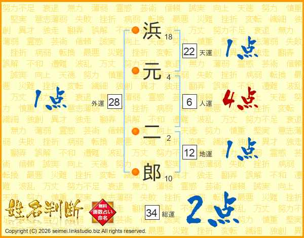 浜元二郎さんの総運は34画の2点!