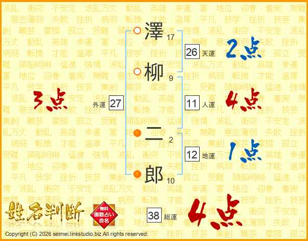 澤(17画)柳(9画) 二(2画)郎(10画)