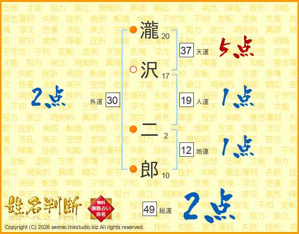 瀧(20画)沢(17画) 二(2画)郎(10画)