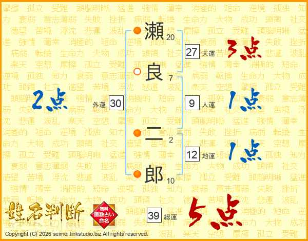 瀬良二郎さんの総運は39画の5点!
