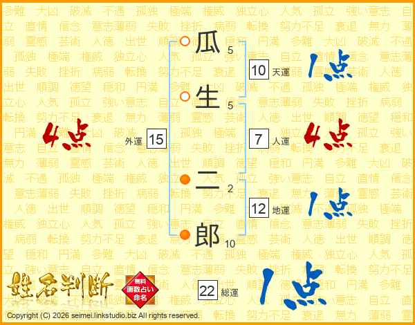 瓜(5画)生(5画) 二(2画)郎(10画)