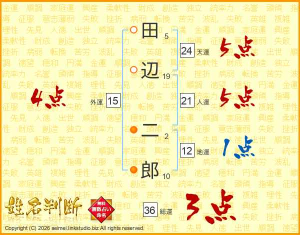 生活面を象徴する運勢です。外部から受ける影響力を表し、結婚運、家庭運や職場、環境への順応性を表します。総運から人運を引いた画数。姓や名が1文字の場合を除く。
