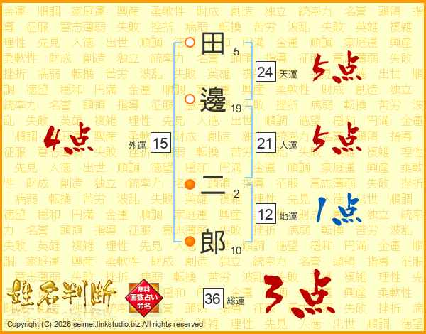 生活面を象徴する運勢です。外部から受ける影響力を表し、結婚運、家庭運や職場、環境への順応性を表します。総運から人運を引いた画数。姓や名が1文字の場合を除く。