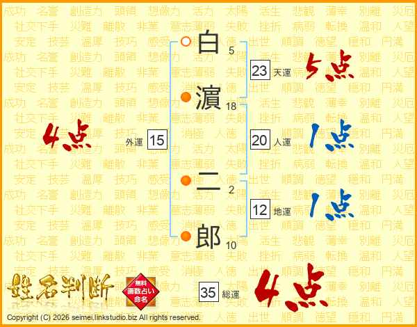 あなたの人生を表す1番重要な運勢です。生涯を通じて影響する総合運となり、主に50歳以降の晩年期に影響を及ぼします。苗字と名前の合計画数。
