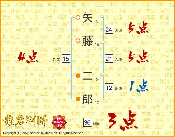 矢(5画)藤(19画) 二(2画)郎(10画)