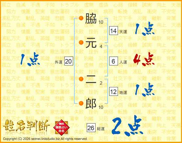 生活面を象徴する運勢です。外部から受ける影響力を表し、結婚運、家庭運や職場、環境への順応性を表します。総運から人運を引いた画数。姓や名が1文字の場合を除く。