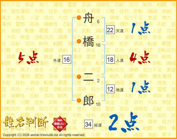 舟(6画)橋(16画) 二(2画)郎(10画)