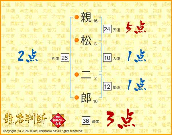 生活面を象徴する運勢です。外部から受ける影響力を表し、結婚運、家庭運や職場、環境への順応性を表します。総運から人運を引いた画数。姓や名が1文字の場合を除く。