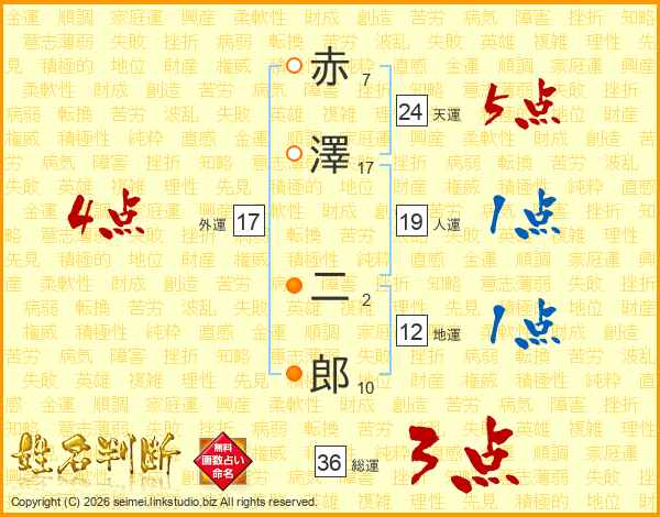 赤澤二郎さんの総運は36画の3点!
