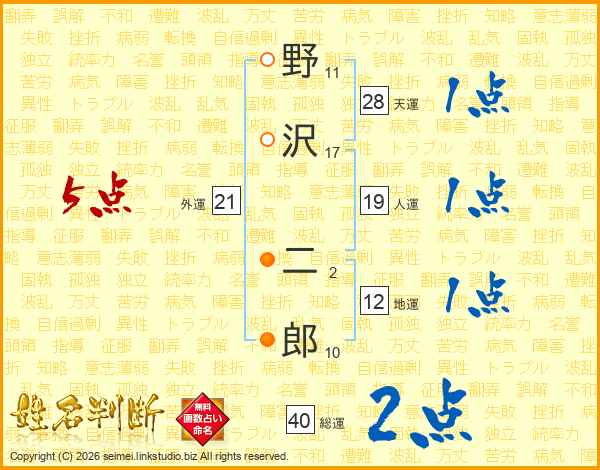 生活面を象徴する運勢です。外部から受ける影響力を表し、結婚運、家庭運や職場、環境への順応性を表します。総運から人運を引いた画数。姓や名が1文字の場合を除く。