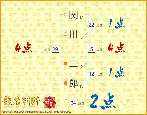 生活面を象徴する運勢です。外部から受ける影響力を表し、結婚運、家庭運や職場、環境への順応性を表します。総運から人運を引いた画数。姓や名が1文字の場合を除く。