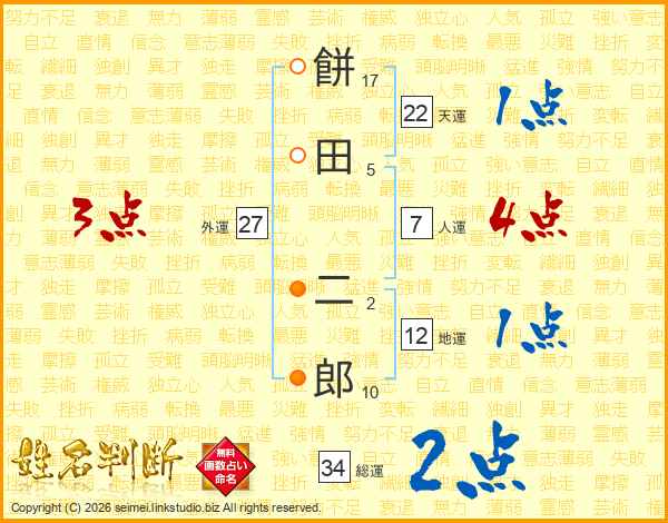 餅田二郎さんの総運は34画の2点!