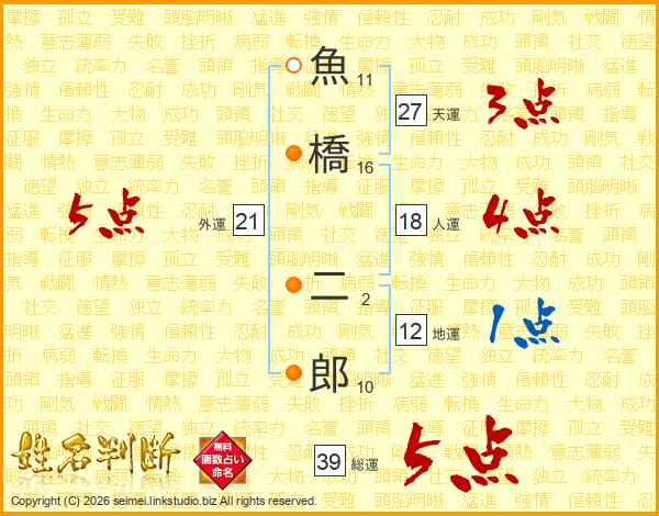 魚(11画)橋(16画) 二(2画)郎(10画)