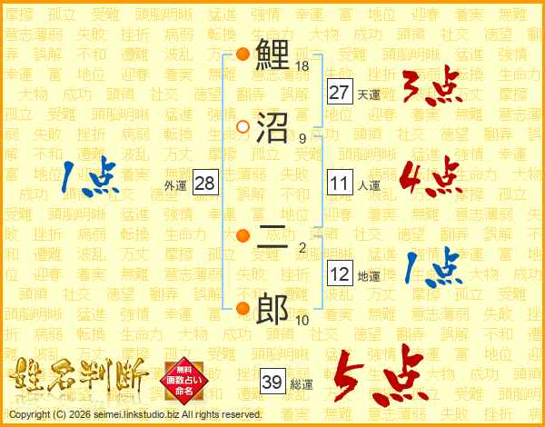 鯉沼二郎さんの総運は39画の5点!