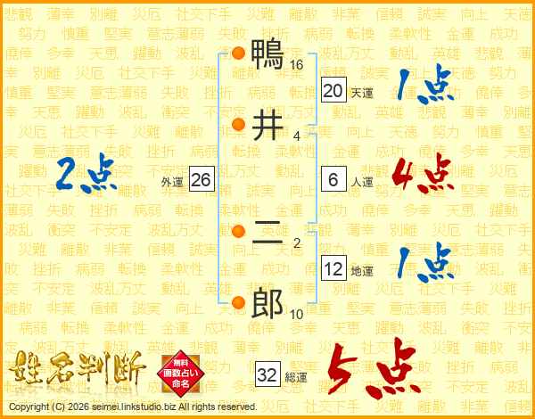 鴨井二郎さんの総運は32画の5点!