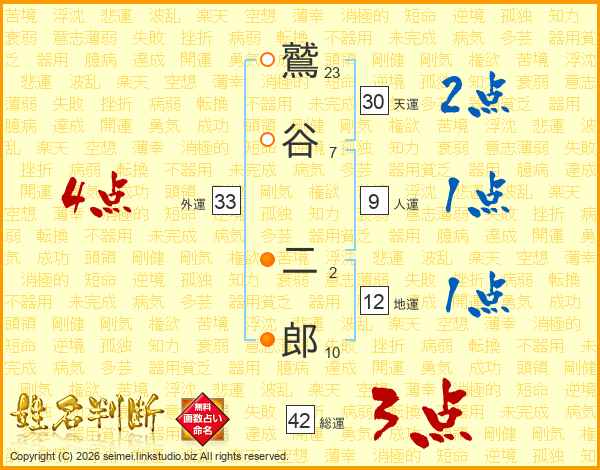 鷲(23画)谷(7画) 二(2画)郎(10画)
