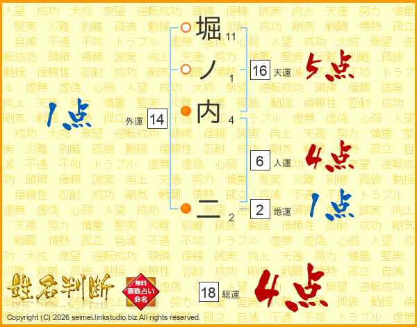 生活面を象徴する運勢です。外部から受ける影響力を表し、結婚運、家庭運や職場、環境への順応性を表します。総運から人運を引いた画数。姓や名が1文字の場合を除く。