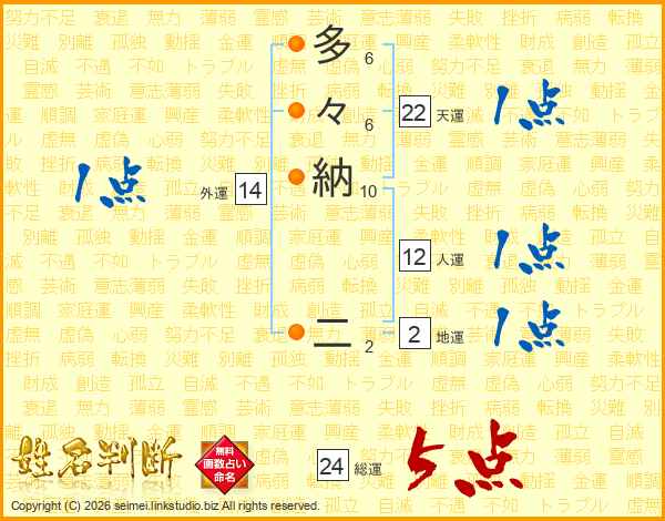 生活面を象徴する運勢です。外部から受ける影響力を表し、結婚運、家庭運や職場、環境への順応性を表します。総運から人運を引いた画数。姓や名が1文字の場合を除く。