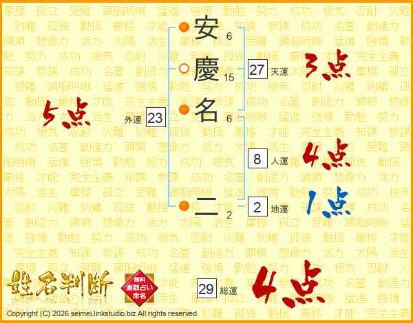 生活面を象徴する運勢です。外部から受ける影響力を表し、結婚運、家庭運や職場、環境への順応性を表します。総運から人運を引いた画数。姓や名が1文字の場合を除く。