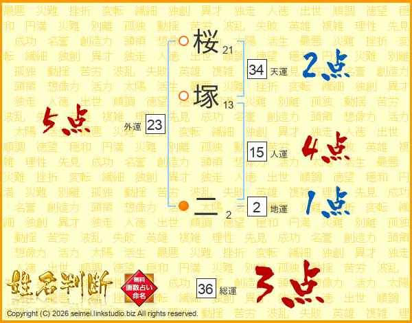あなたの人生を表す1番重要な運勢です。生涯を通じて影響する総合運となり、主に50歳以降の晩年期に影響を及ぼします。苗字と名前の合計画数。