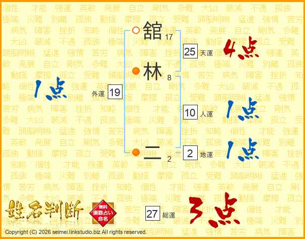 生活面を象徴する運勢です。外部から受ける影響力を表し、結婚運、家庭運や職場、環境への順応性を表します。総運から人運を引いた画数。姓や名が1文字の場合を除く。