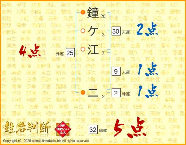 鐘ケ江二さんの総運は32画の5点!
