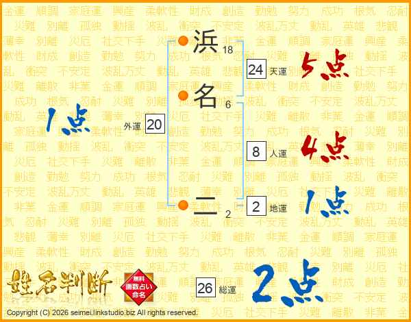 生活面を象徴する運勢です。外部から受ける影響力を表し、結婚運、家庭運や職場、環境への順応性を表します。総運から人運を引いた画数。姓や名が1文字の場合を除く。