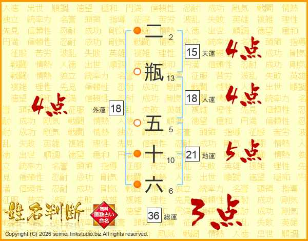 生活面を象徴する運勢です。外部から受ける影響力を表し、結婚運、家庭運や職場、環境への順応性を表します。総運から人運を引いた画数。姓や名が1文字の場合を除く。