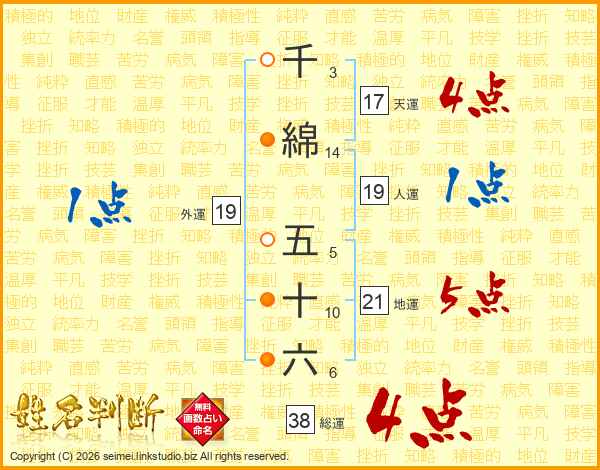生活面を象徴する運勢です。外部から受ける影響力を表し、結婚運、家庭運や職場、環境への順応性を表します。総運から人運を引いた画数。姓や名が1文字の場合を除く。