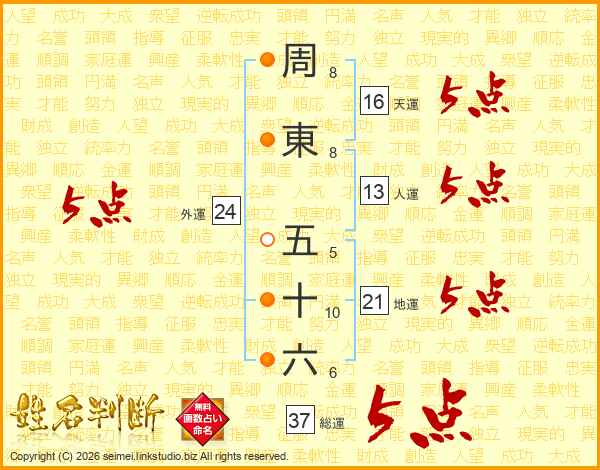 あなたの人生を表す1番重要な運勢です。生涯を通じて影響する総合運となり、主に50歳以降の晩年期に影響を及ぼします。苗字と名前の合計画数。
