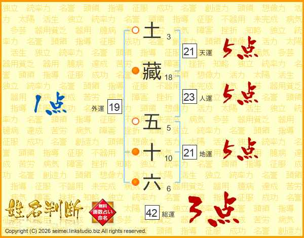 生活面を象徴する運勢です。外部から受ける影響力を表し、結婚運、家庭運や職場、環境への順応性を表します。総運から人運を引いた画数。姓や名が1文字の場合を除く。