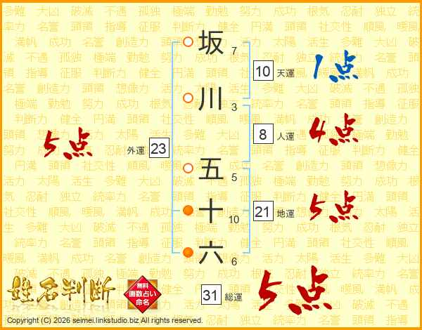 生活面を象徴する運勢です。外部から受ける影響力を表し、結婚運、家庭運や職場、環境への順応性を表します。総運から人運を引いた画数。姓や名が1文字の場合を除く。