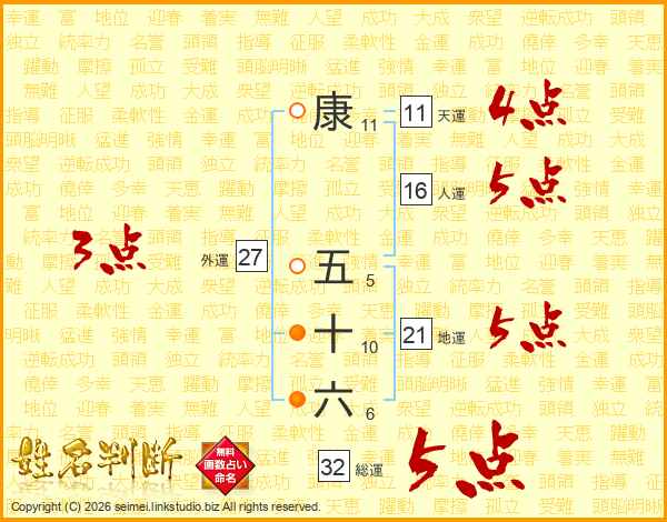 あなたの人生を表す1番重要な運勢です。生涯を通じて影響する総合運となり、主に50歳以降の晩年期に影響を及ぼします。苗字と名前の合計画数。