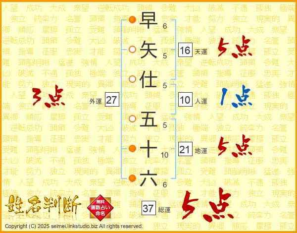 あなたの人生を表す1番重要な運勢です。生涯を通じて影響する総合運となり、主に50歳以降の晩年期に影響を及ぼします。苗字と名前の合計画数。