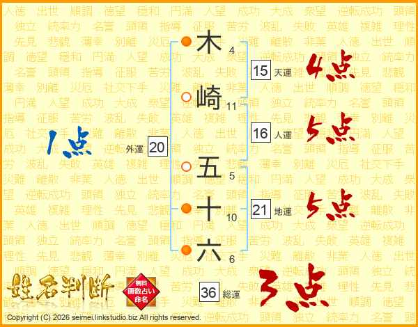 木(4画)崎(11画) 五(5画)十(10画)六(6画)