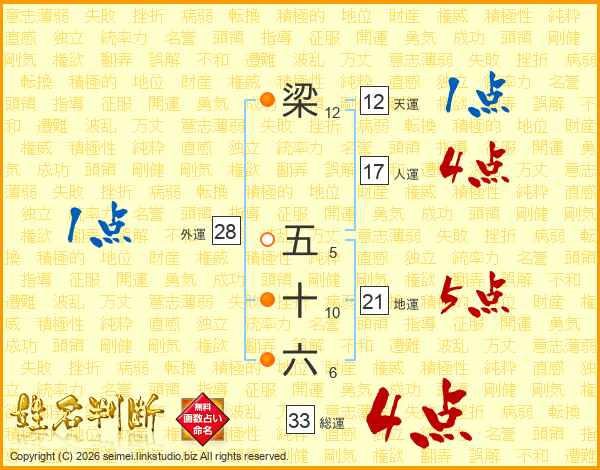 生活面を象徴する運勢です。外部から受ける影響力を表し、結婚運、家庭運や職場、環境への順応性を表します。総運から人運を引いた画数。姓や名が1文字の場合を除く。