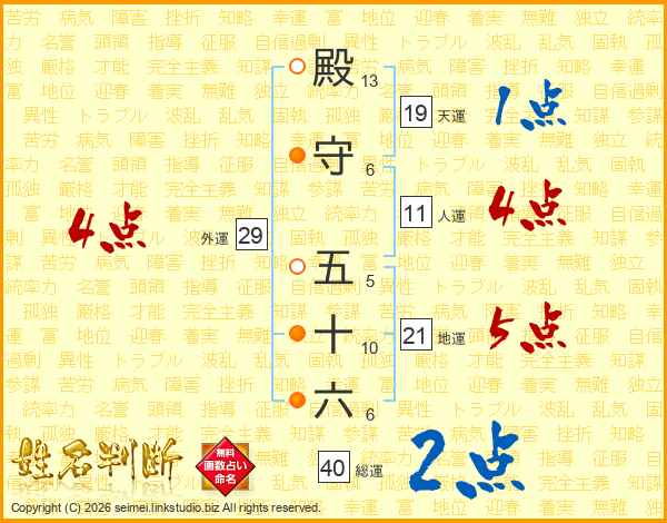 殿(13画)守(6画) 五(5画)十(10画)六(6画)