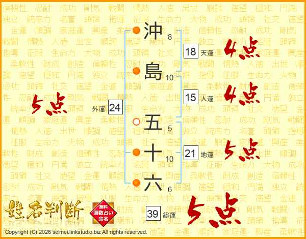 沖(8画)島(10画) 五(5画)十(10画)六(6画)