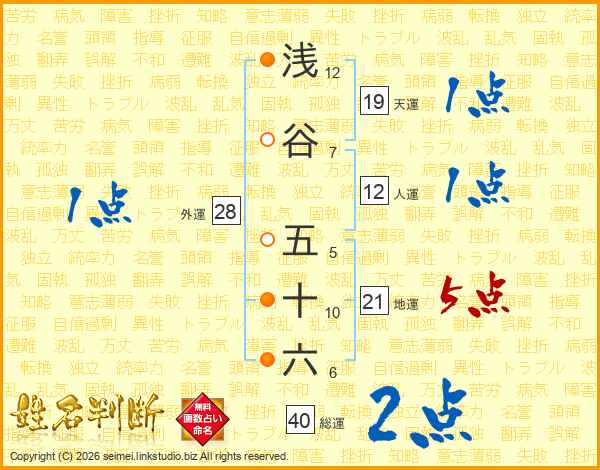 生活面を象徴する運勢です。外部から受ける影響力を表し、結婚運、家庭運や職場、環境への順応性を表します。総運から人運を引いた画数。姓や名が1文字の場合を除く。