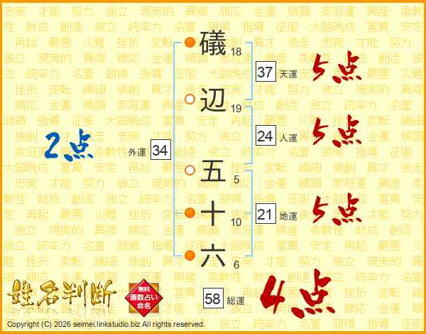 生活面を象徴する運勢です。外部から受ける影響力を表し、結婚運、家庭運や職場、環境への順応性を表します。総運から人運を引いた画数。姓や名が1文字の場合を除く。