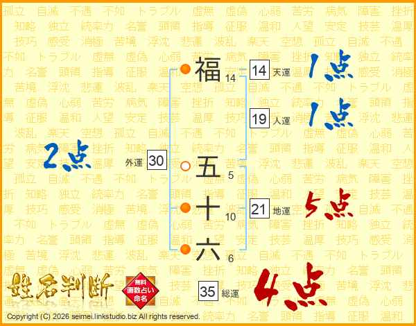 生活面を象徴する運勢です。外部から受ける影響力を表し、結婚運、家庭運や職場、環境への順応性を表します。総運から人運を引いた画数。姓や名が1文字の場合を除く。