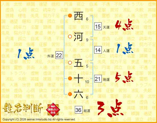 生活面を象徴する運勢です。外部から受ける影響力を表し、結婚運、家庭運や職場、環境への順応性を表します。総運から人運を引いた画数。姓や名が1文字の場合を除く。