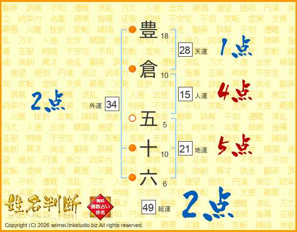 豊倉五十六さんの総運は49画の2点!